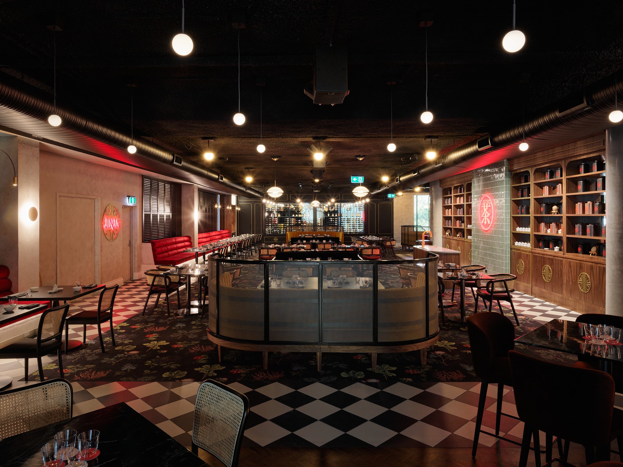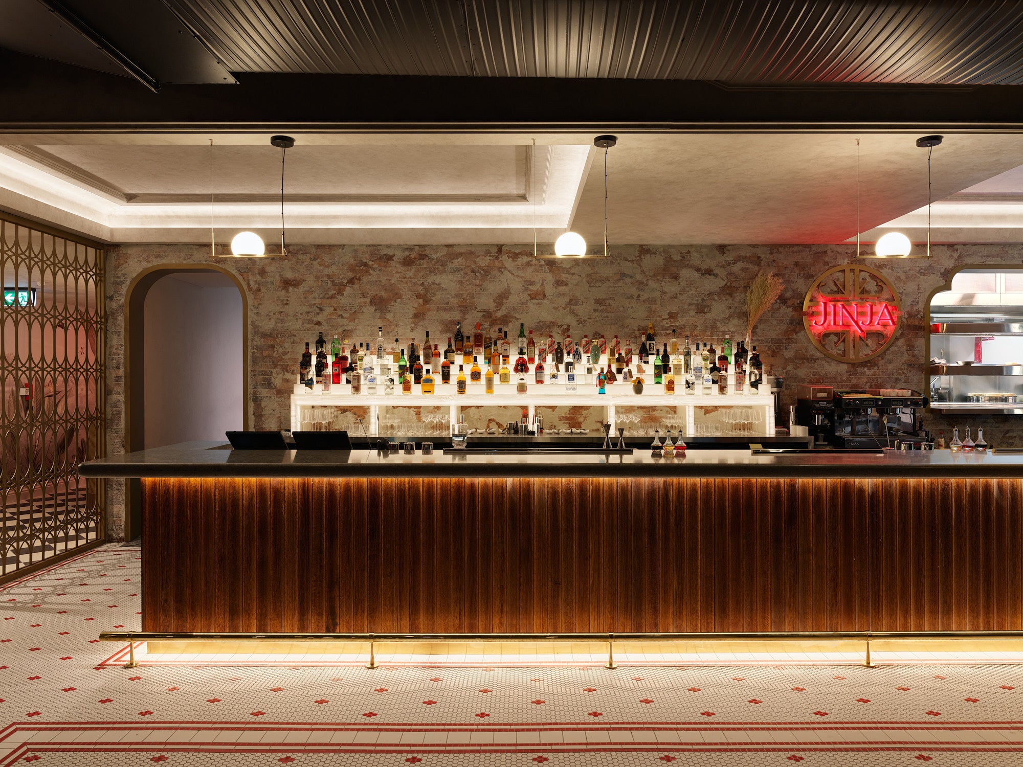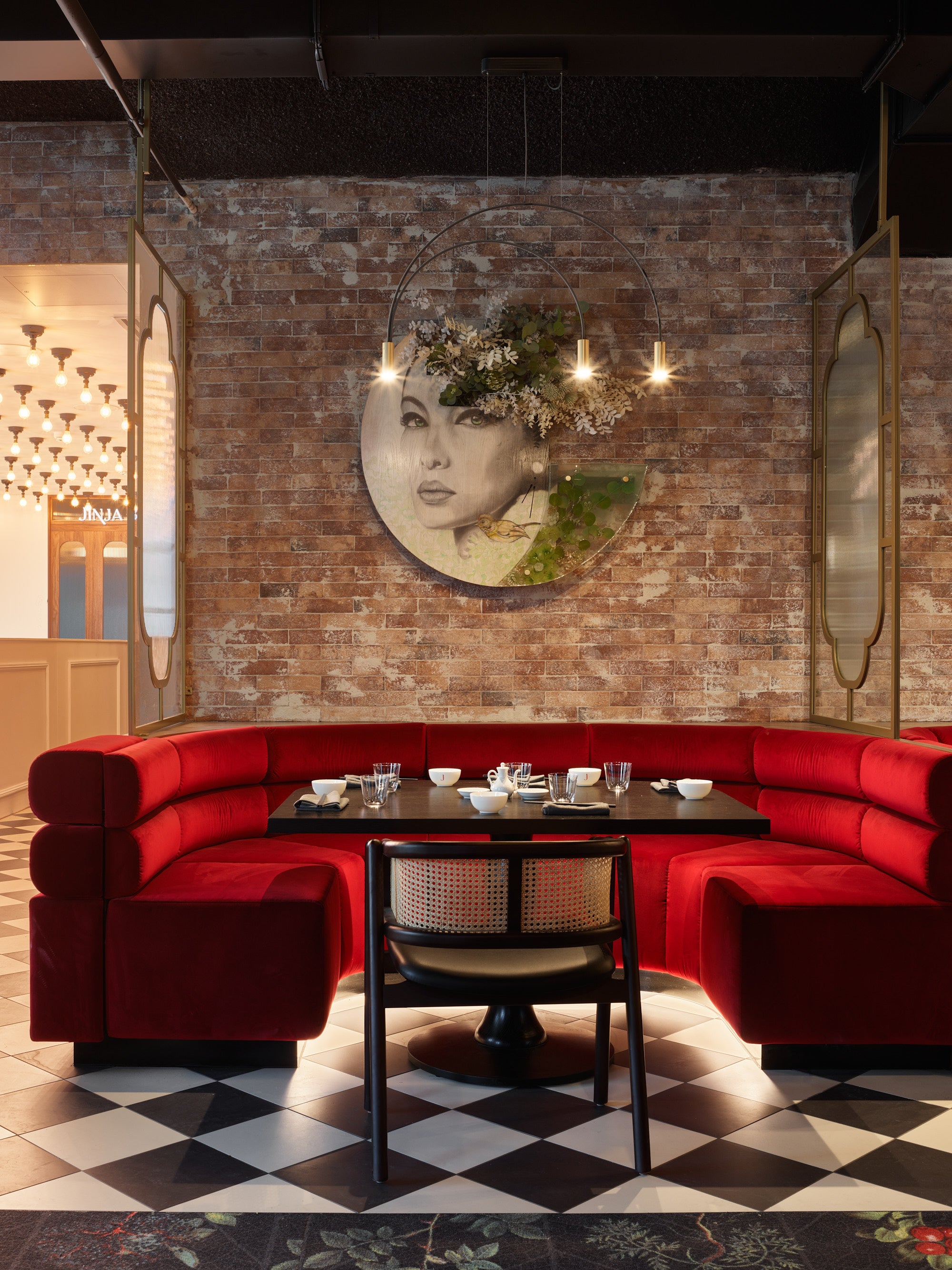 Jinja Restaurant is an immersive dining destination where tradition meets modern elegance. The vision by Archebiosis was to create a space that captures the essence of old Shanghai, classic Hong Kong, and contemporary Beijing, blending textures like exposed brickwork with rich tones of red, black, and gold. Warm timber flooring, floral accents, curved booth seating, and glowing neon signage complete this sensory journey through Chinese cultural heritage.