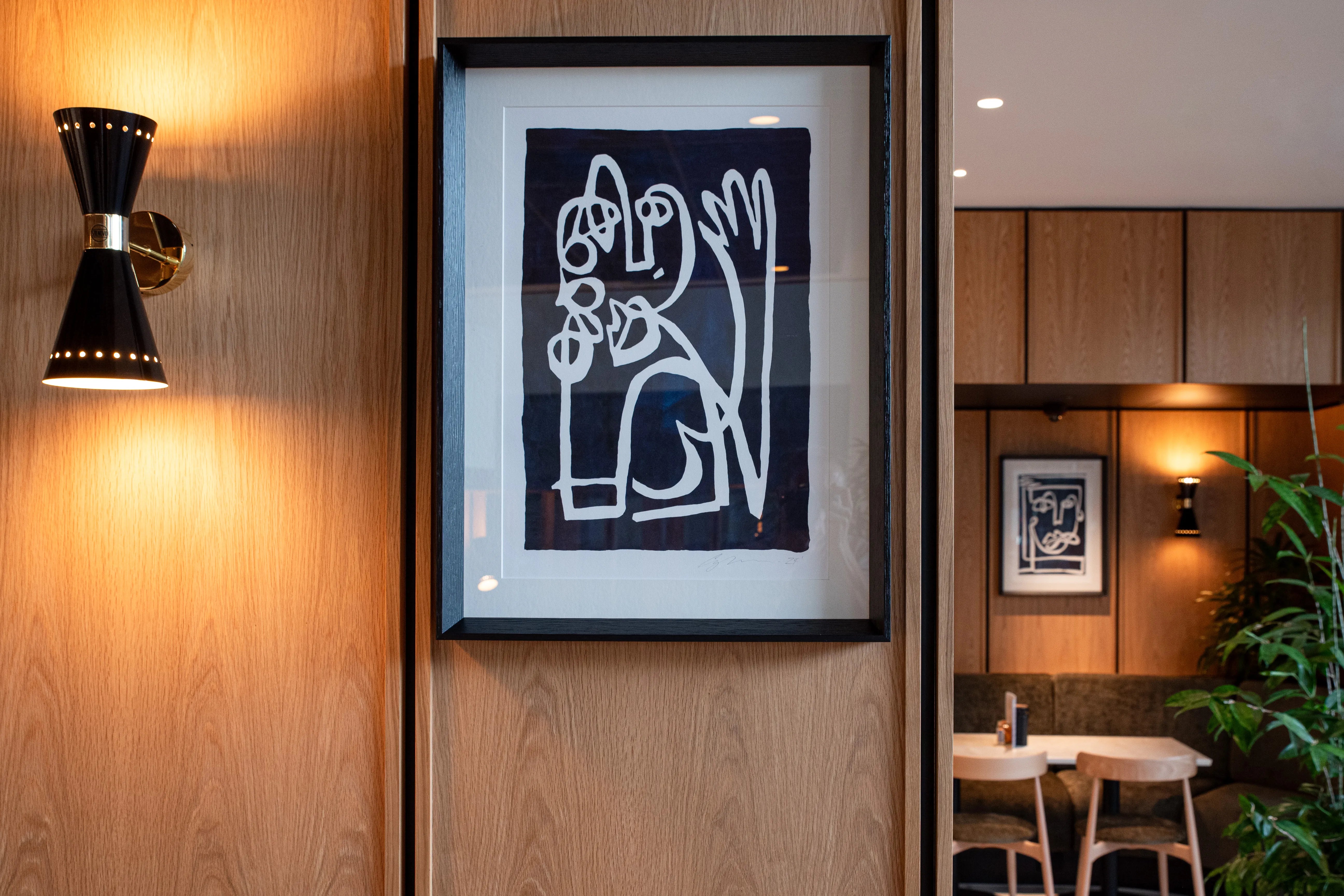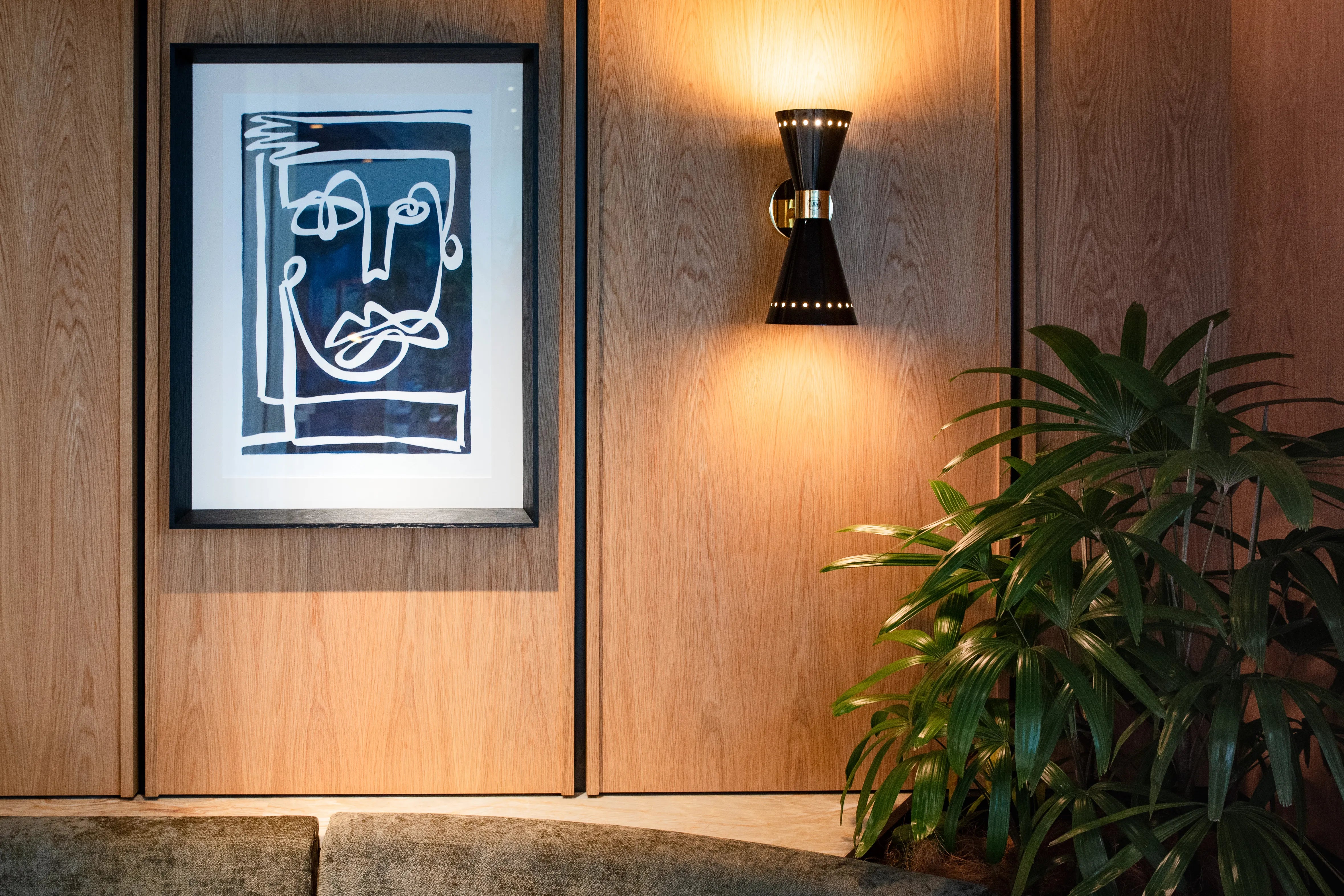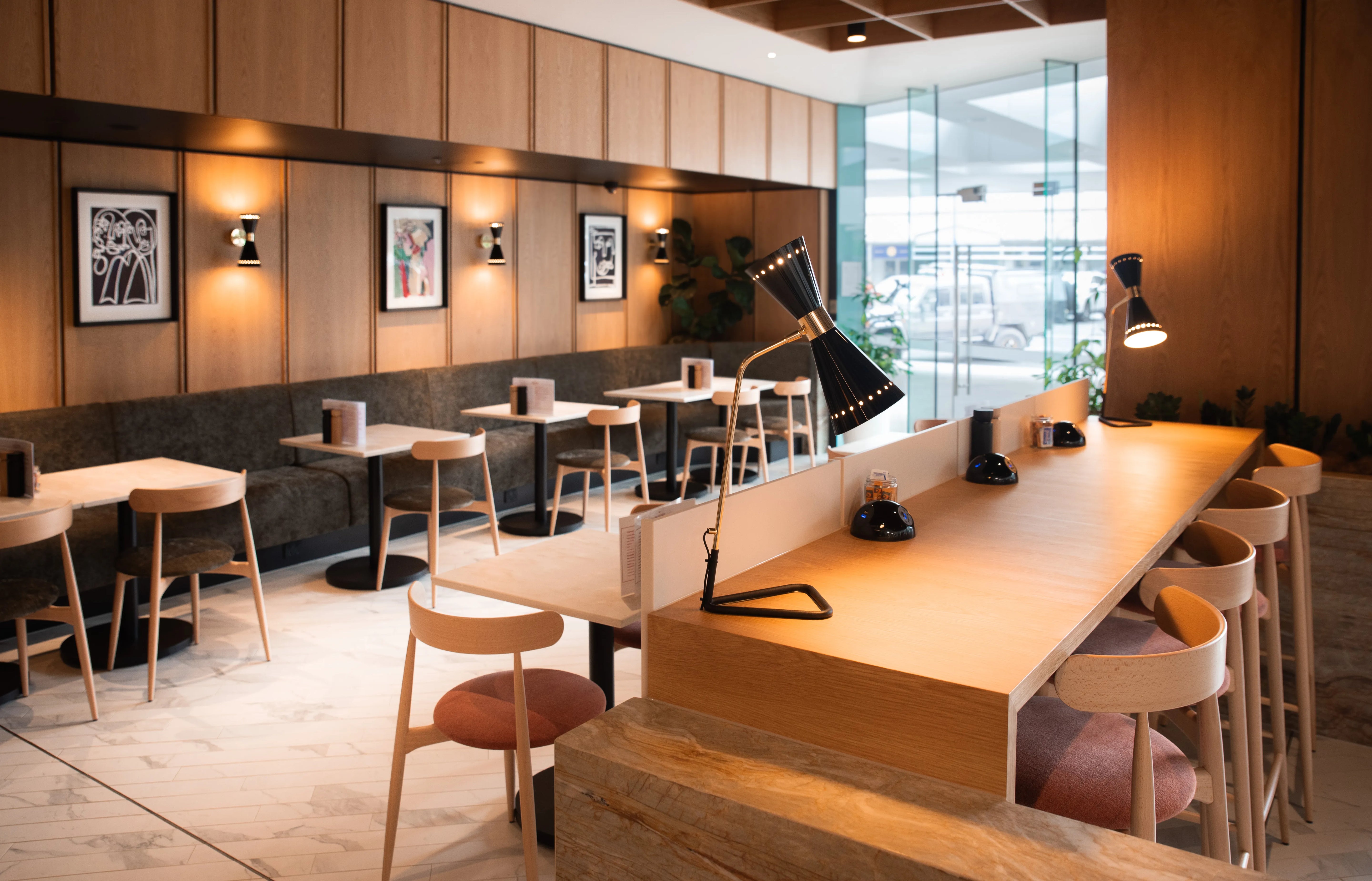 One of the standout features of Coffee Buoy is its sophisticated lighting design. The space is adorned with the Megafono collection, including wall lights and table lamps that exude mid-century elegance. With their distinctive black finish and dual-light feature, the Megafono lights create a captivating play of light, highlighting both the ceilings and surfaces below. The wall-mounted lights, in particular, enhance the cozy booths and seating areas, casting an intimate glow that complements the rich textures of the furnishings.