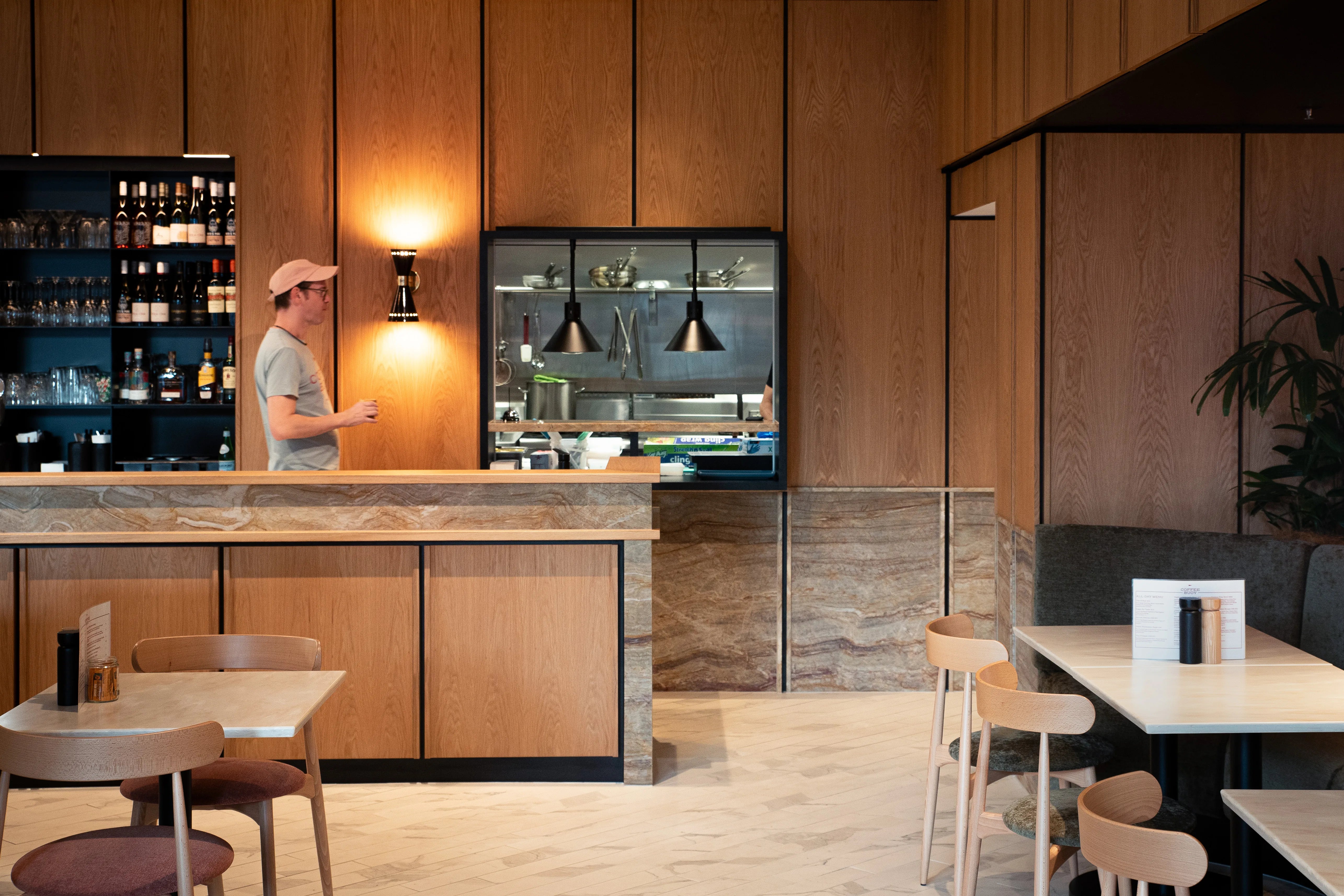 Adding to the visual interest is the coffered wood ceiling, punctuated by integrated can lights that provide functional illumination while maintaining the overall design integrity. This thoughtful attention to detail underscores the refined aesthetic of Coffee Buoy, making it a space that effortlessly marries practicality with beauty.