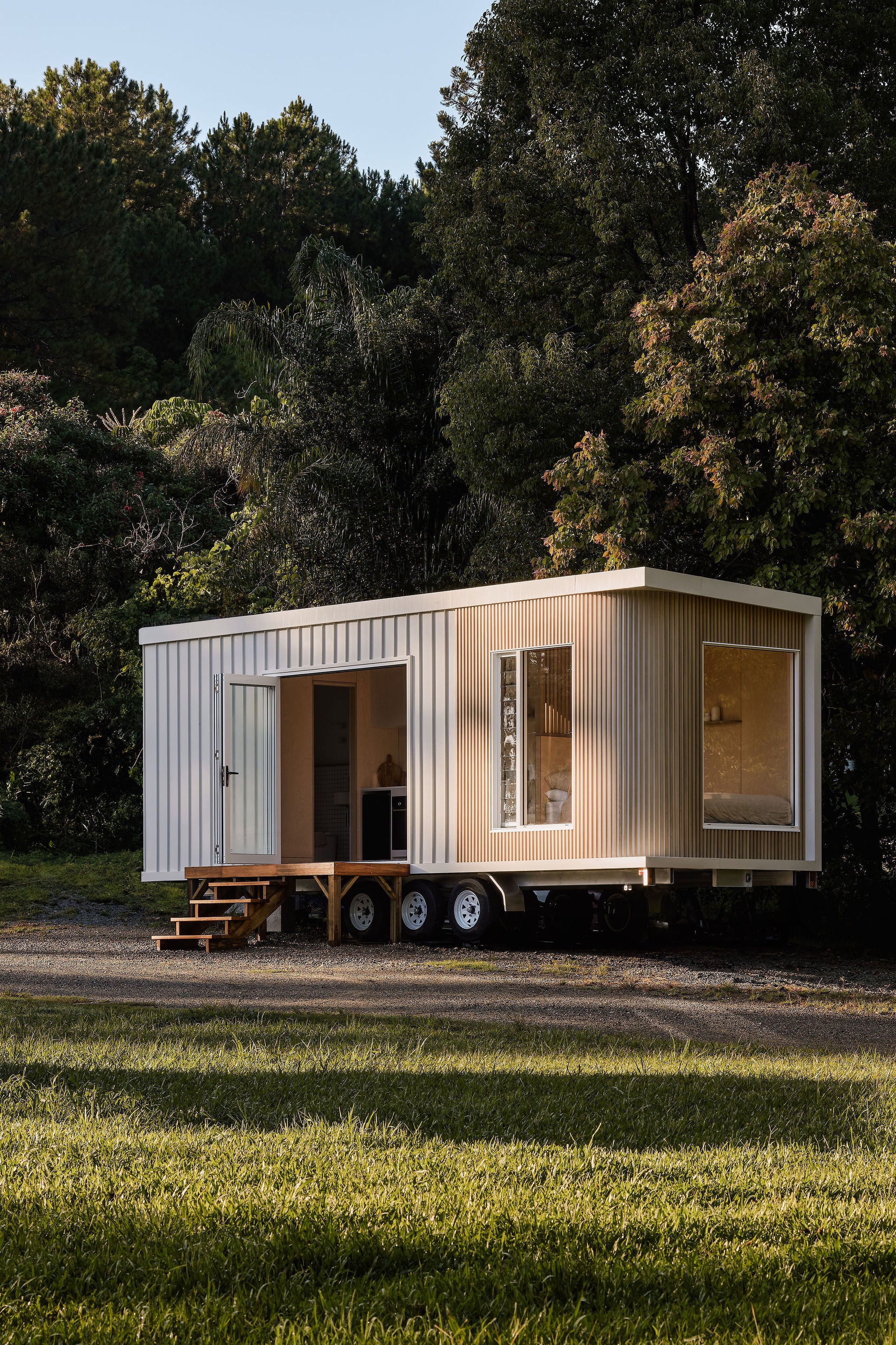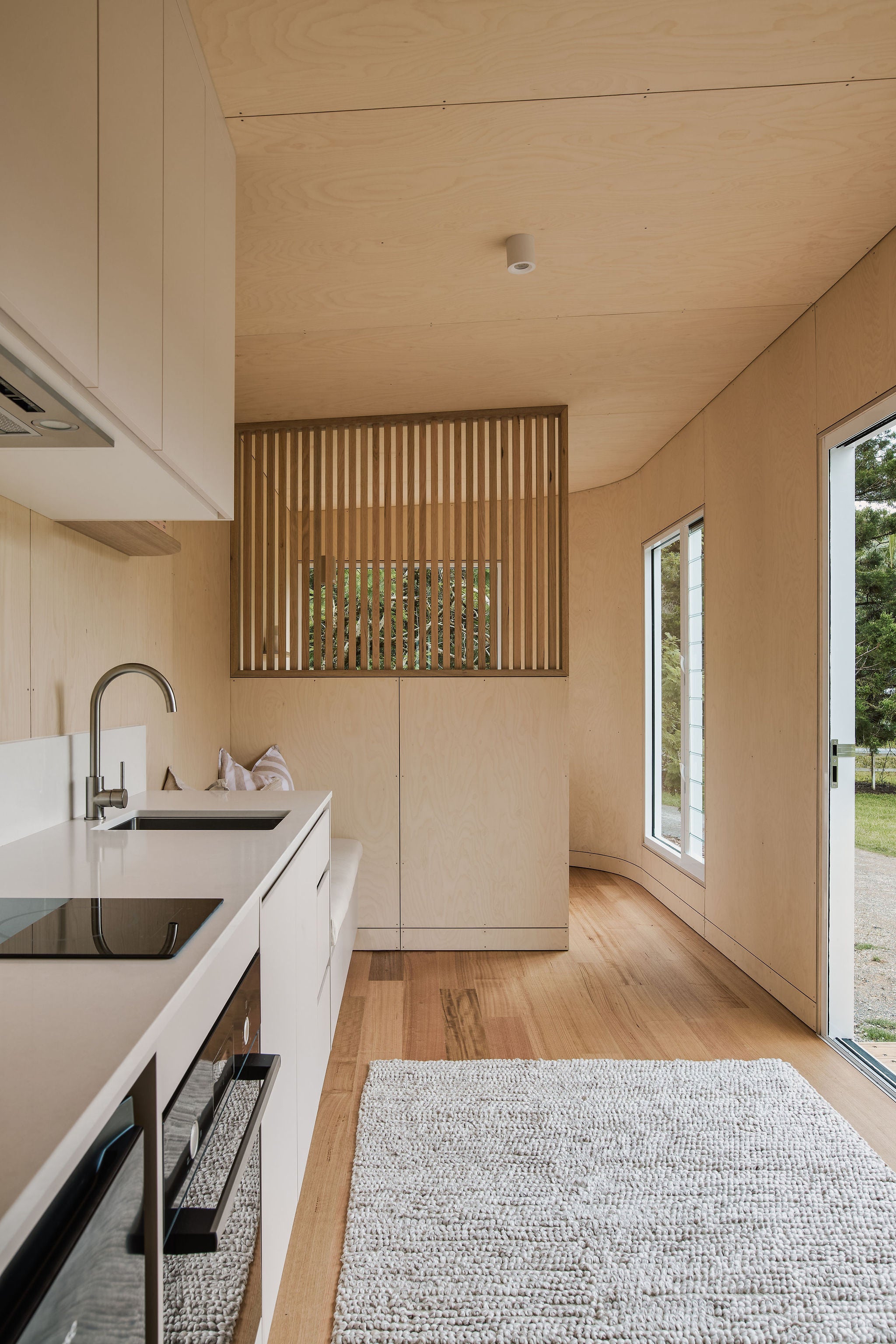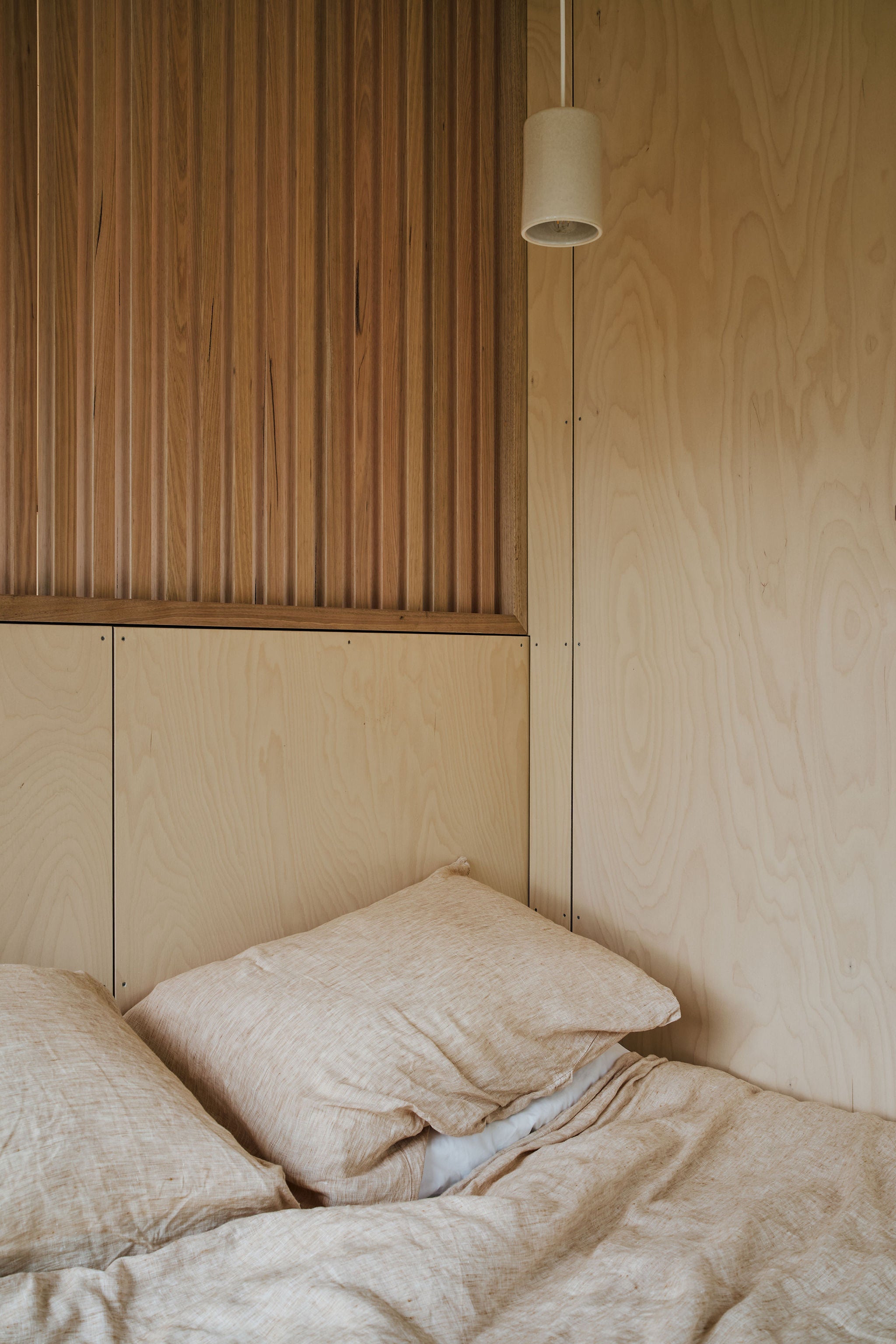 Designed and built by Black Clay, Harper Tiny Home embodies modern minimalism while maintaining a warm and inviting aesthetic. Thoughtfully tailored to its environment, the tiny home features a custom-built Tasmanian Oak screen and Birch Ply interior walls. The use of these natural materials not only enhances the aesthetic appeal but also ensures longevity and durability.
