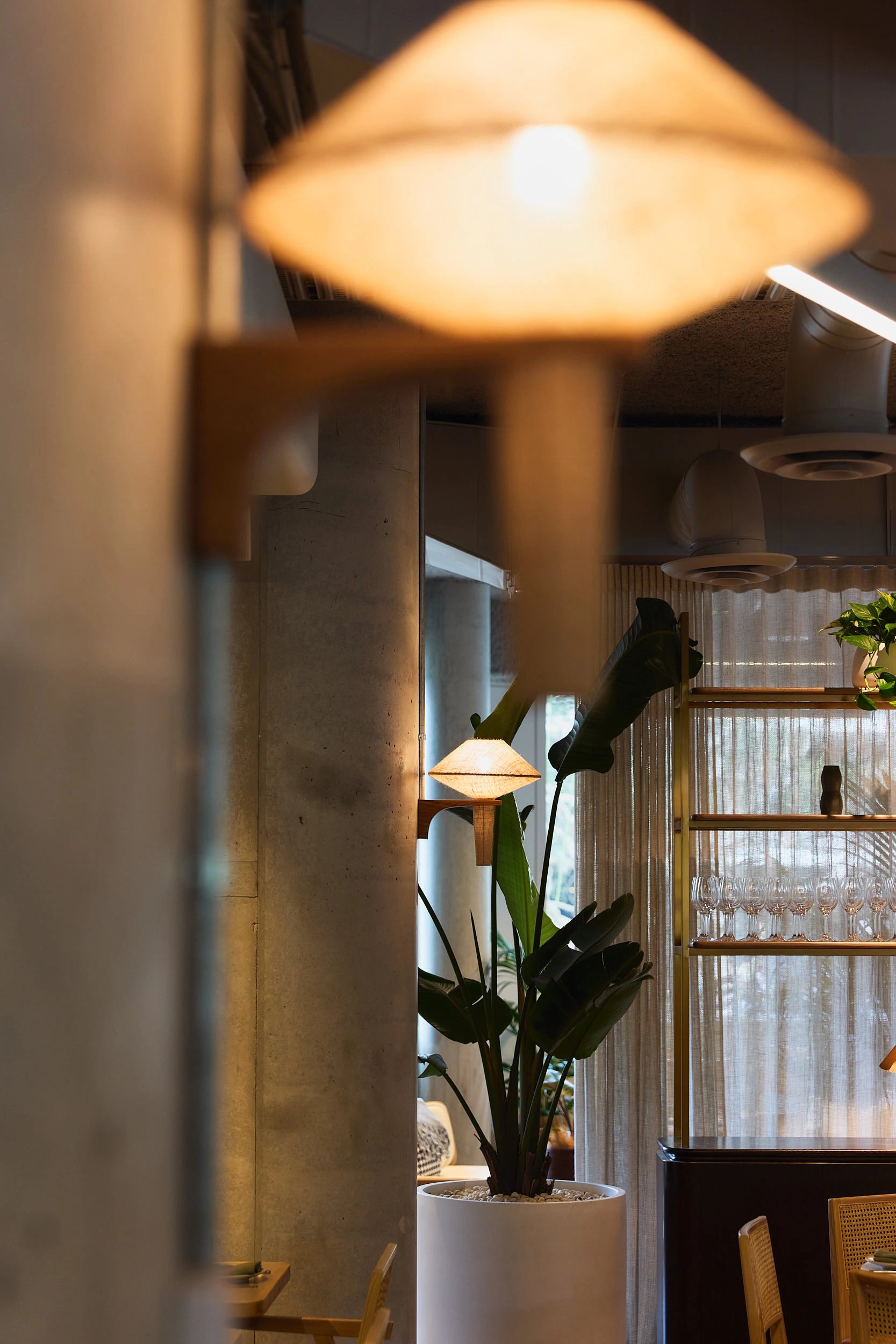 Handcrafted with a soft linen shade and timber accent, this fixture adds a delicate, warm glow to the venue’s structural columns and perimeter walls. Its artisanal quality complements the natural finishes throughout Soluna and provides ambient depth without overwhelming the space.