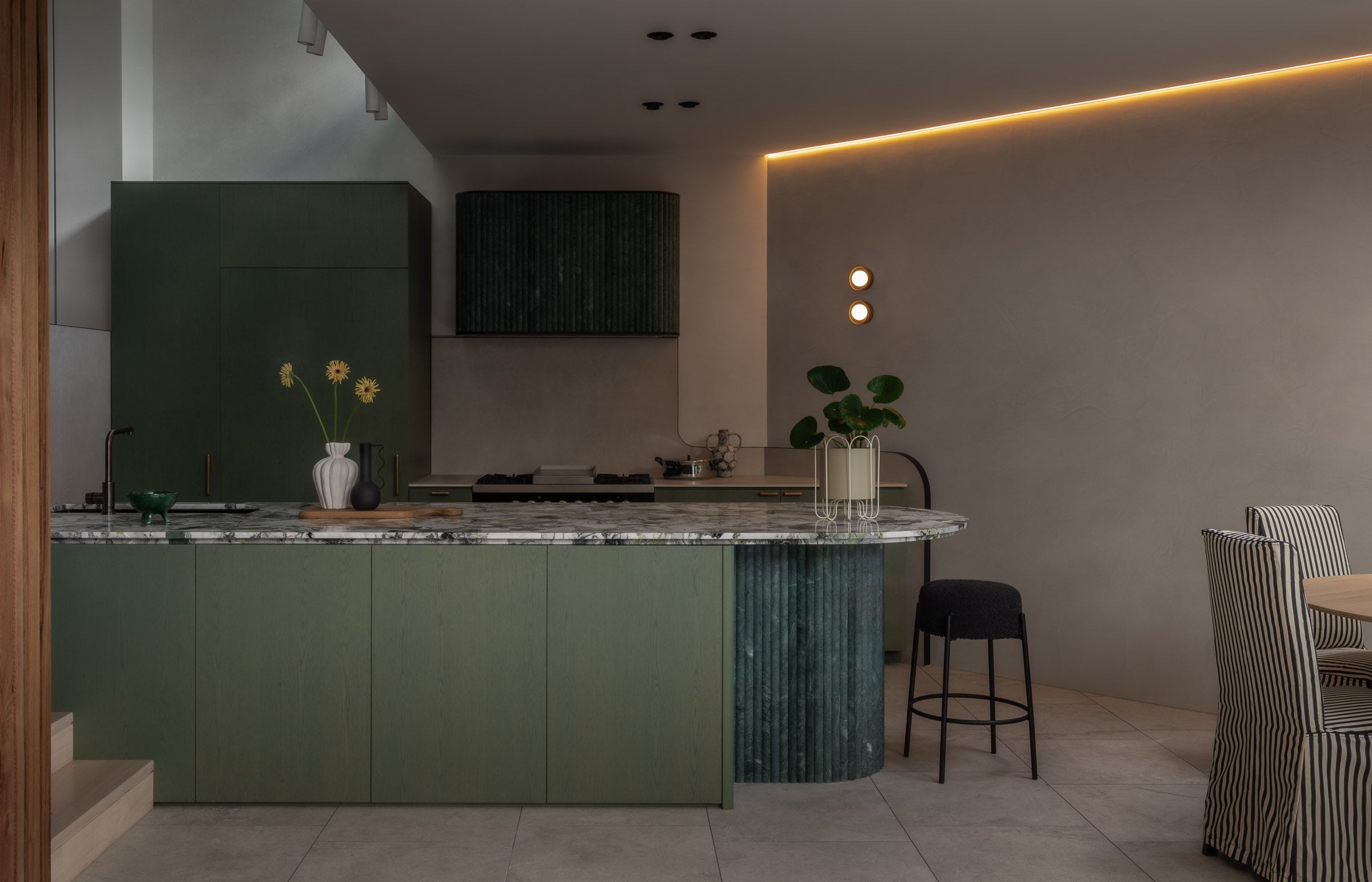 The Summer Hill Residence exudes warmth and refinement, seamlessly combining natural materials with contemporary accents. The deep green cabinetry and veined marble countertops in the kitchen make a bold yet balanced statement. Soft neutral tones and textures - such as panelling and stone, run throughout the home, creating a cohesive and inviting aesthetic.
