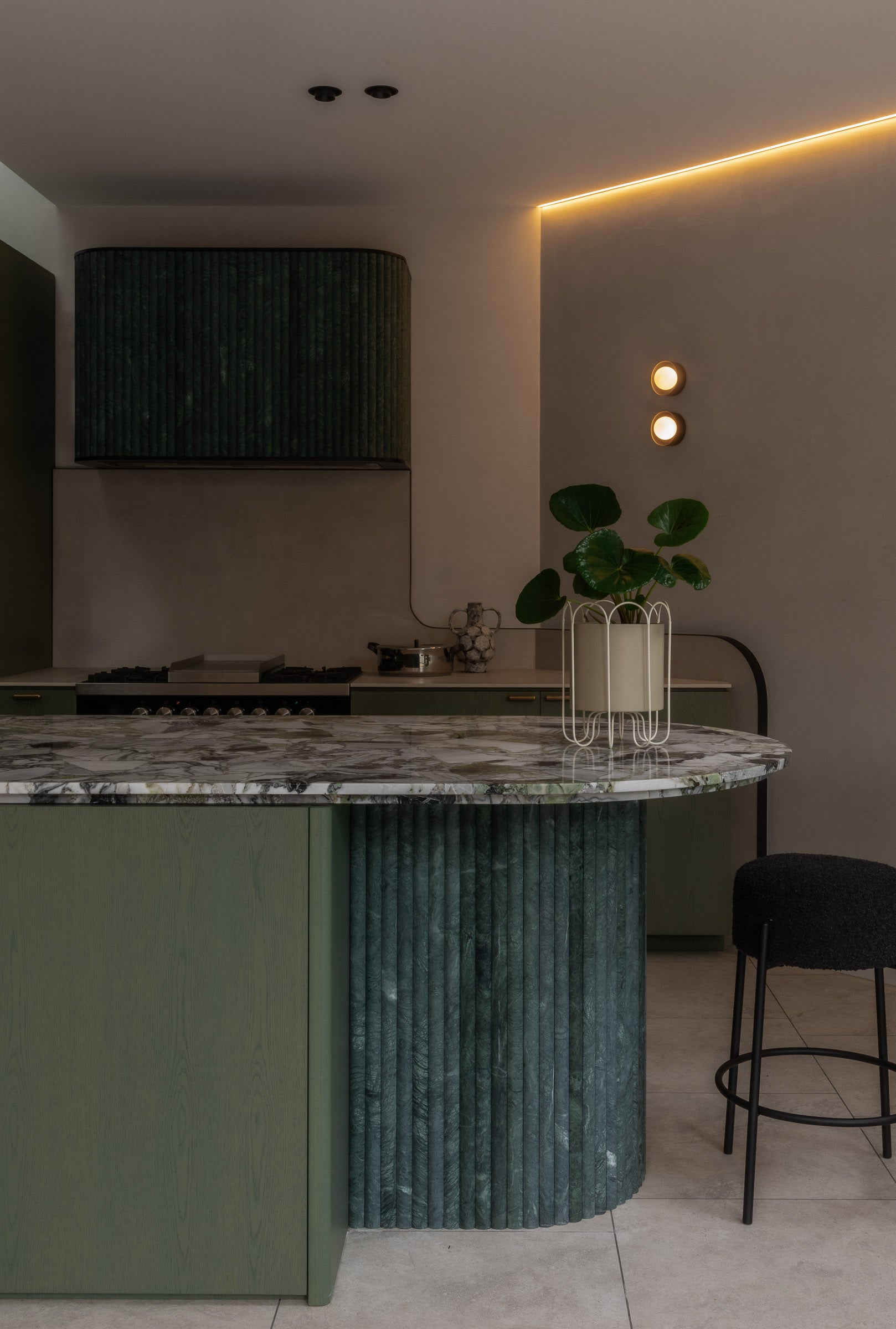 - Orb Sur Wall Light: Positioned to enhance the ambiance, this light adds depth and texture to the space, making it feel both modern and intimate.