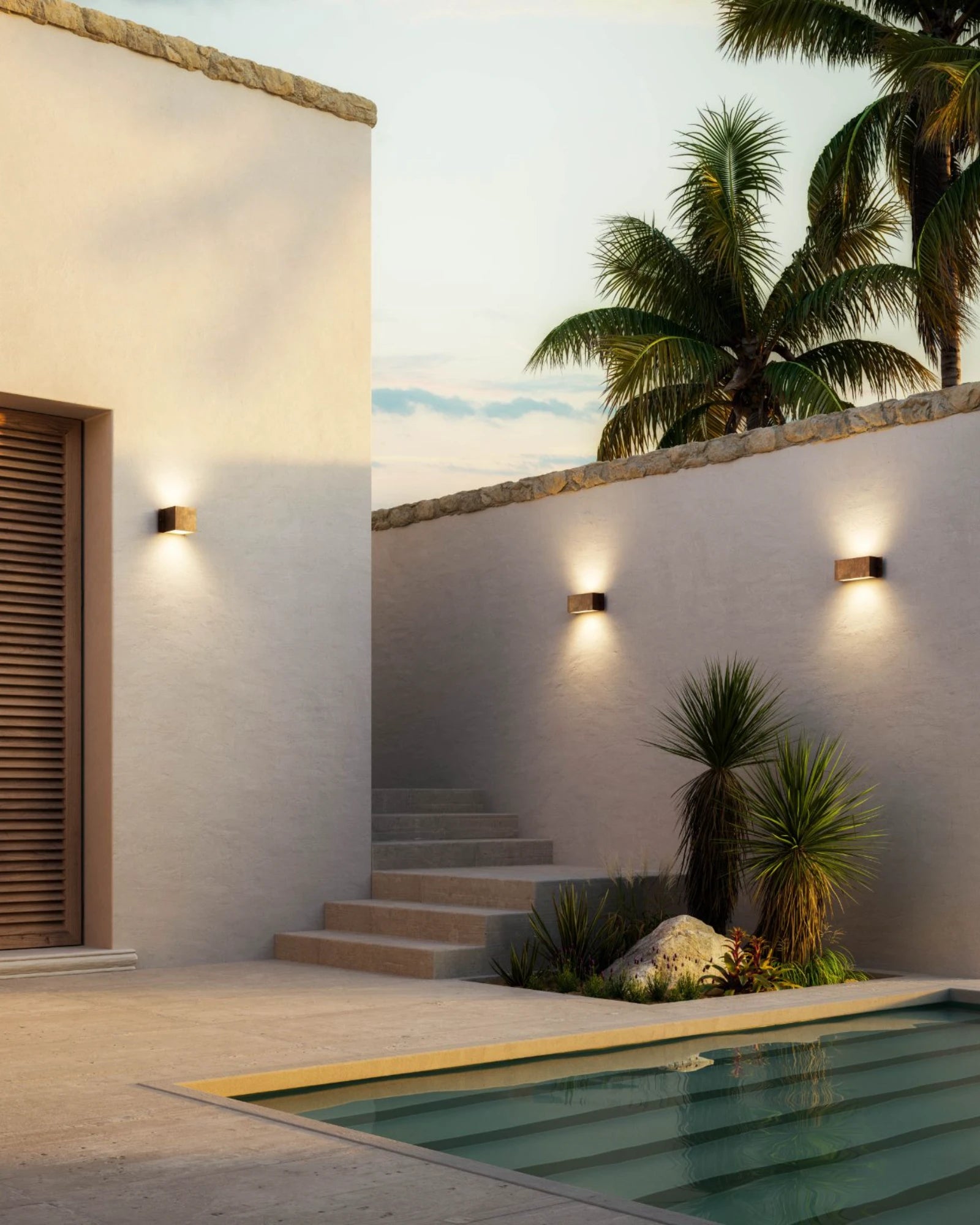 Street scene with potted plants and illuminated venezia up wall lights by Il Fanale on a building facade.Venezia Up Wall Light