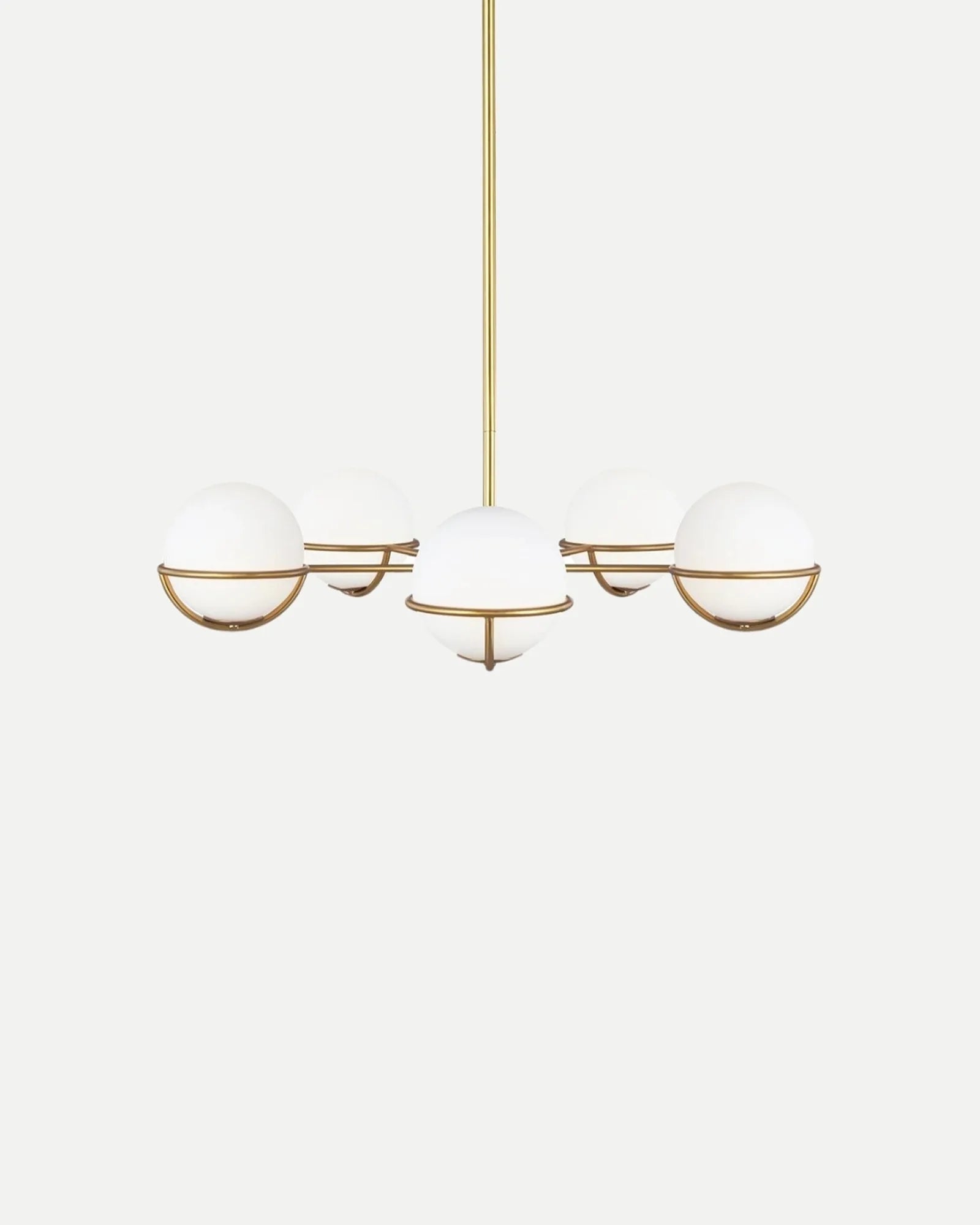The Apollo 5lt Pendant Light showcases a stunning modernist design, featuring five perfectly balanced white opal etched glass orbs that rest gracefully within a sleek spherical frame. Available in burnished brass or polished nickel finishes, this pendant light brings a touch of mid-century elegance with a cosmic flair. Its artistic design makes it an eye-catching statement piece, ideal for dining rooms, living areas, or entryways. With its contemporary aesthetic and sophisticated balance, the Apollo 5lt Pendant Light is perfect for adding a touch of luxury to any space.