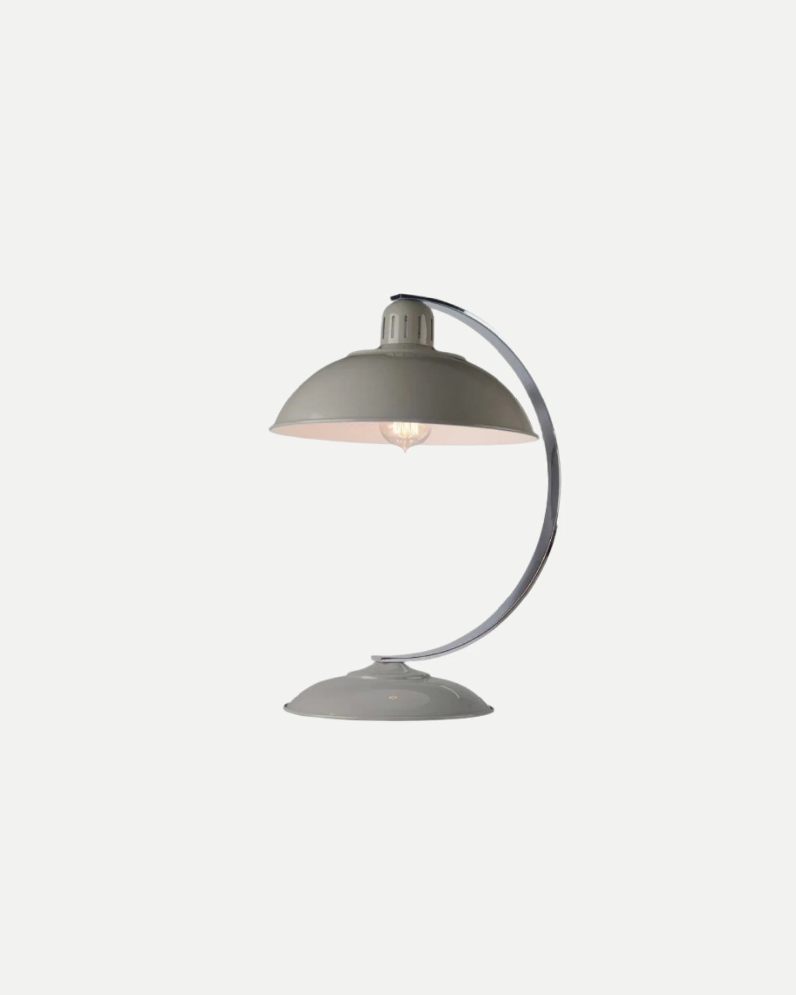 The Franklin Table Lamp combines retro charm with versatile design, featuring a curved Polished Chrome arm and a metal spun shade and base. Available in Oyster White, Red, Tarpaulin Grey, or Reed Green, this transitional lamp complements a variety of interiors. Perfect for home offices, living rooms, or bedrooms, the Franklin Table Lamp blends functionality with vintage-inspired style.